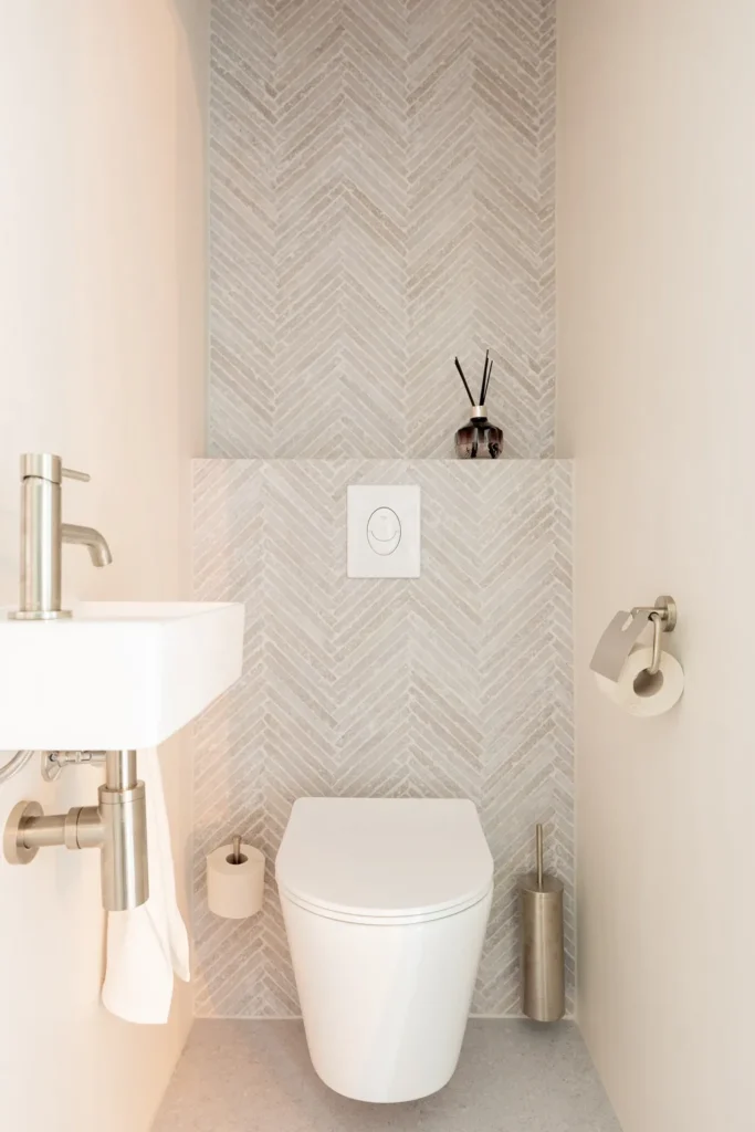 Het toilet in Velp sluit volledig aan op de badkamerstijl. De lichte visgraatstructuur op de achterwand vormt een subtiele eyecatcher en zorgt voor een zachte uitstraling. De zandkleurige wanden en RVS details versterken de Natural Soft Minimal trend en maken het toilet tot een stijlvol verlengde van de badkamer.